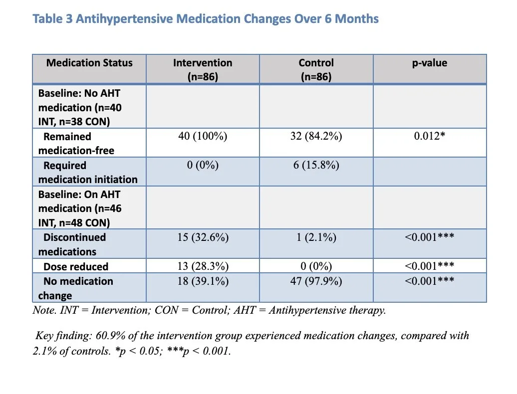 Medication effects: 32.6% of intervention participants discontinued antihypertensive medications and 28.3% had dose reductions, compared to 2.1% and 0% respectively, in controls.