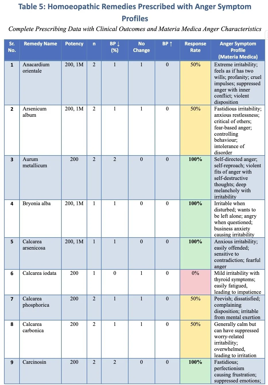 Conclusion: Individualised homoeopathic treatment as adjuvant therapy demonstrated statistically significant improvements in anger management and blood pressure control compared to standard care alone, with associated reductions in antihypertensive medication requirements. The therapeutic consultation process itself appeared to confer additional benefits. Future double-blind studies with larger sample sizes are warranted.