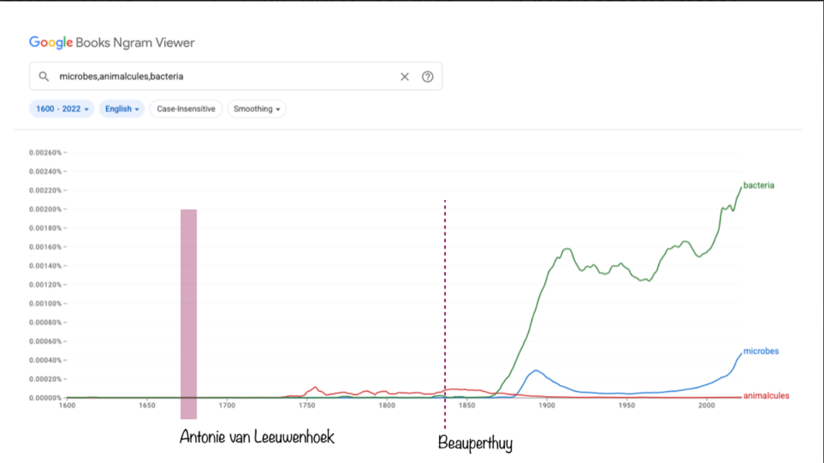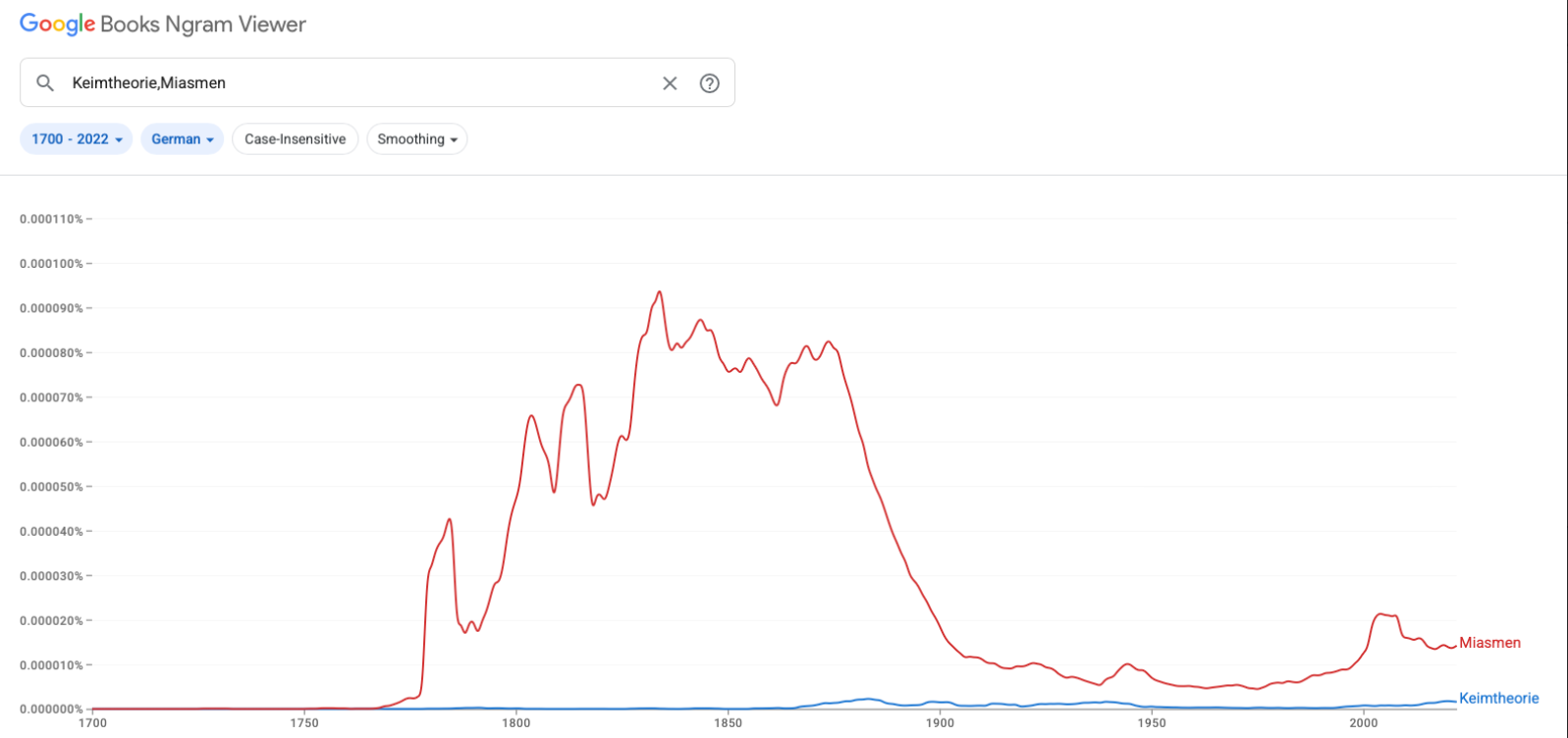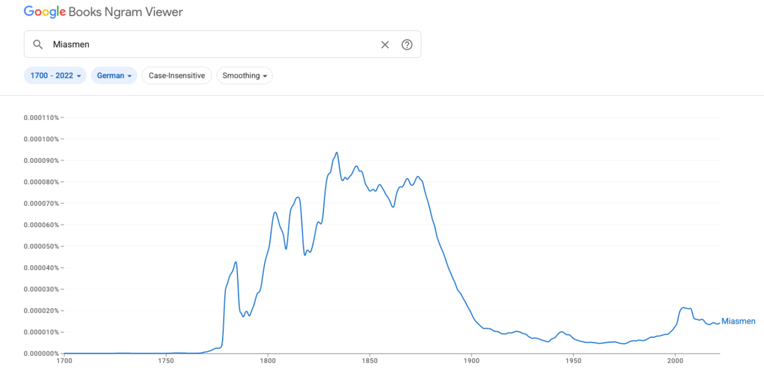 The Google Ngram viewer (https://en.wikipedia.org/wiki/Google_Books_Ngram_Viewer) displays the frequency of appearance of a term or phrase in the world’s literature from 1500 through the present, normed to the number of words in publication in a given year. I’ll be relying on these throughout to trace the development of concepts. Here, use of the term “miasm” (German, Miasmen) in the world’s English and German language literature: