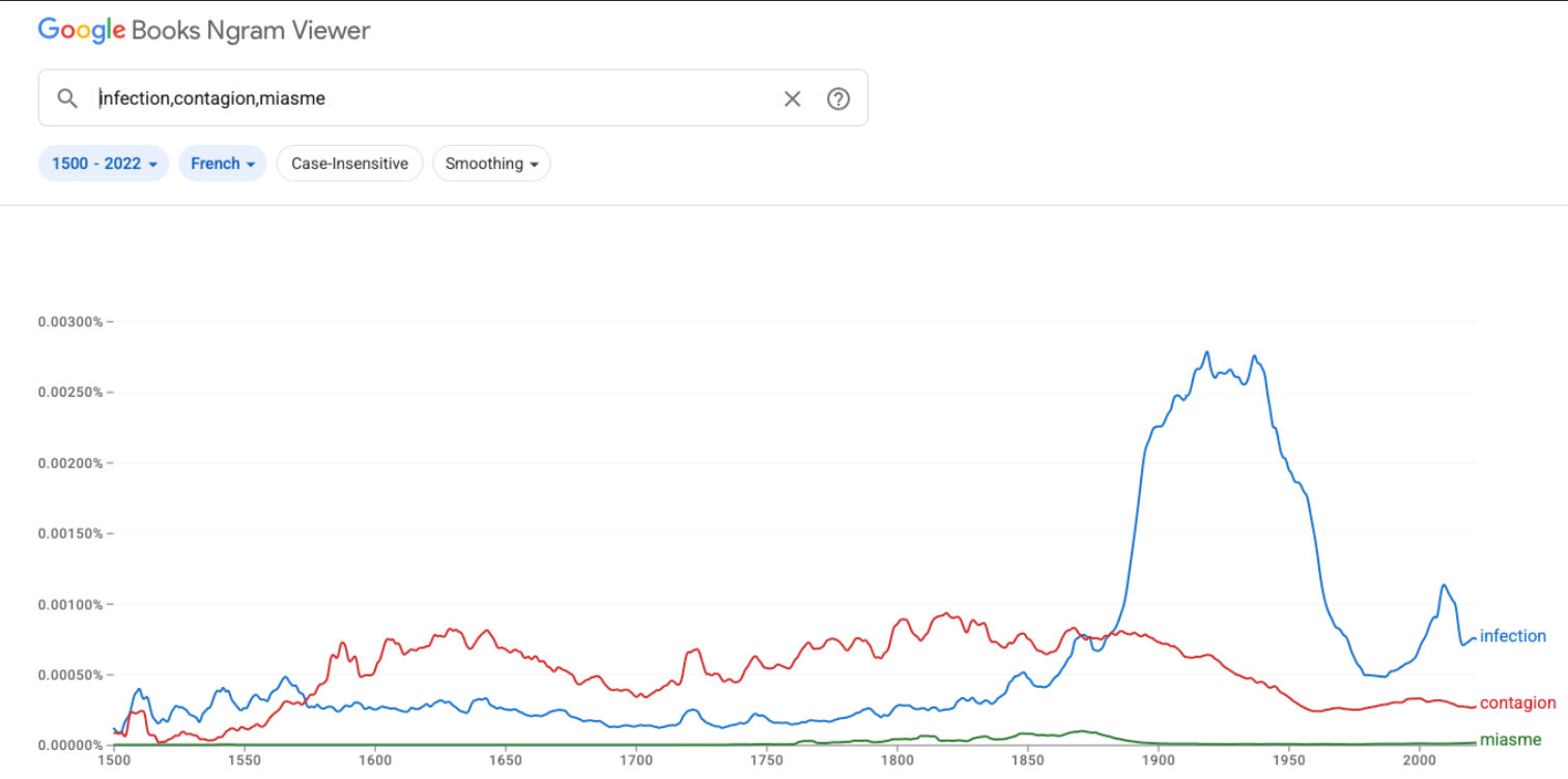 Fig. 7 - infection,contagion,miasme in the French literature, 1500-present