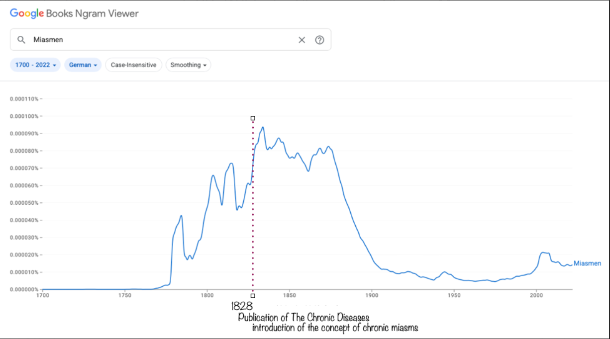 Fig. 2 - search for "Miasmen" in Google's N-gram viewer, displaying the frequency of mention, normed to the number of words in publication, in the world's German language literature.