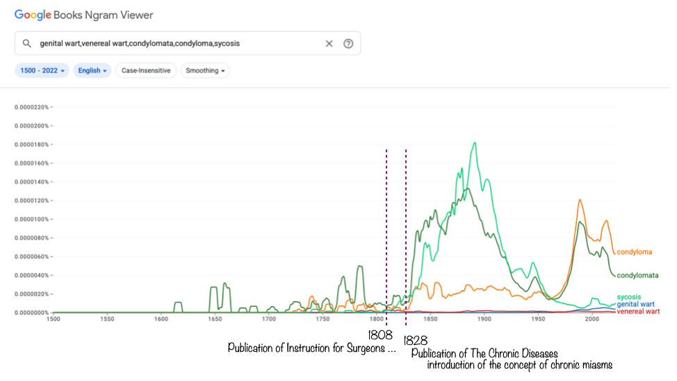 Hahnemann had previously described Sycosis in its acute venereal presentation in his 1789 essay Instruction for Surgeons Respecting Venereal Diseases. The accepted authority on venereal disease in the late 1700s through the 1800s was the Scottish surgeon John Hunter, who proposed that all venereal disease resulted from syphilis. Hahnemann broke from this dogma, and distinguished the genital figwart - condyloma accuminata