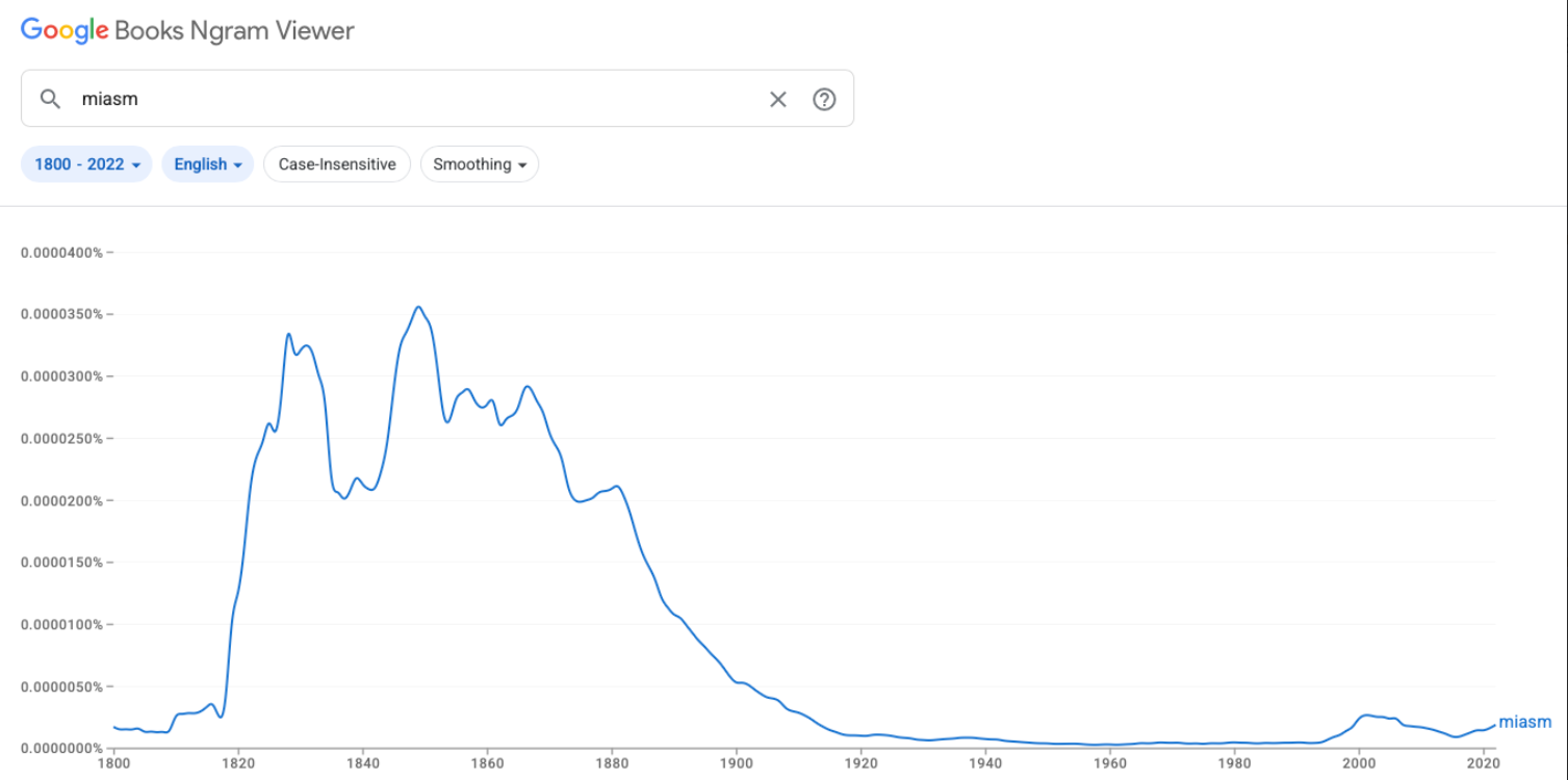 Fig. 1 - search for "miasm" in Google's N-gram viewer, displaying the frequency of mention, normed to the number of words in publication, in the world's English language literature.