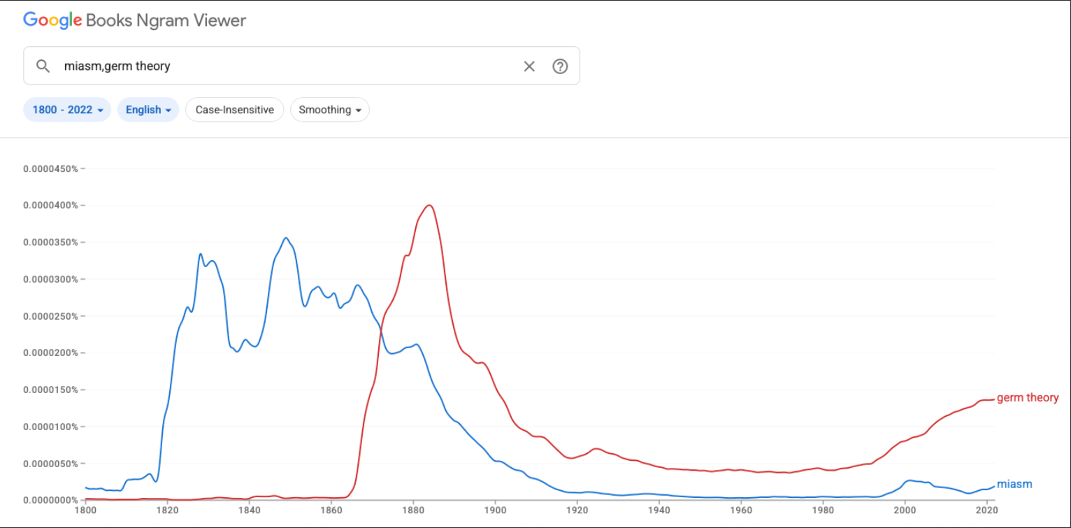 Fig. 5 - Google N-gram search for "miasm" and "germ theory" in the English language literature, 1800-present