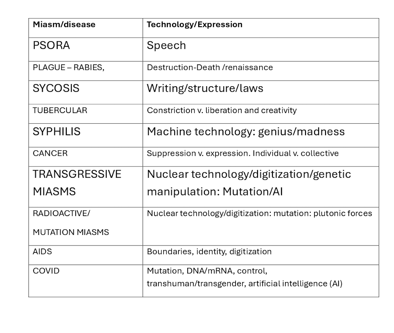 Therefore, Fraser states that Psora can be equated with the technology of speech, Sycosis with the technology of writing, Syphilis with the technology of the first machine and AIDS, with the technology of digitization. These links may be seen as abstract and metaphorical but example a more symbolic way of thinking about miasms and not just the literal meaning that Hahnemann gave them.