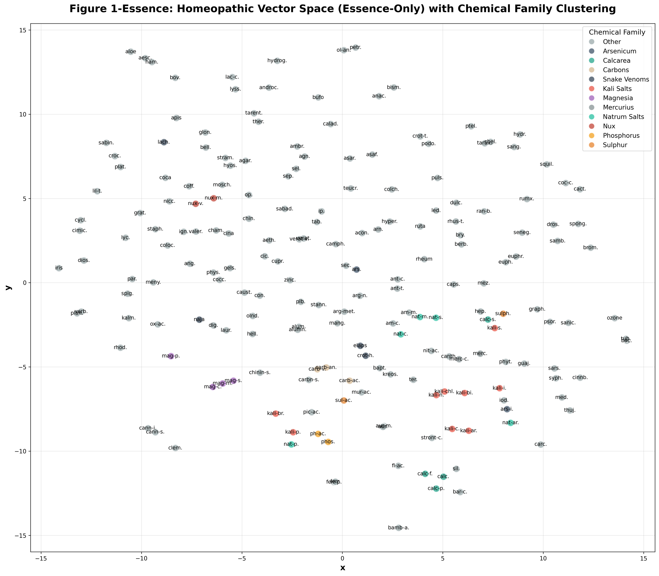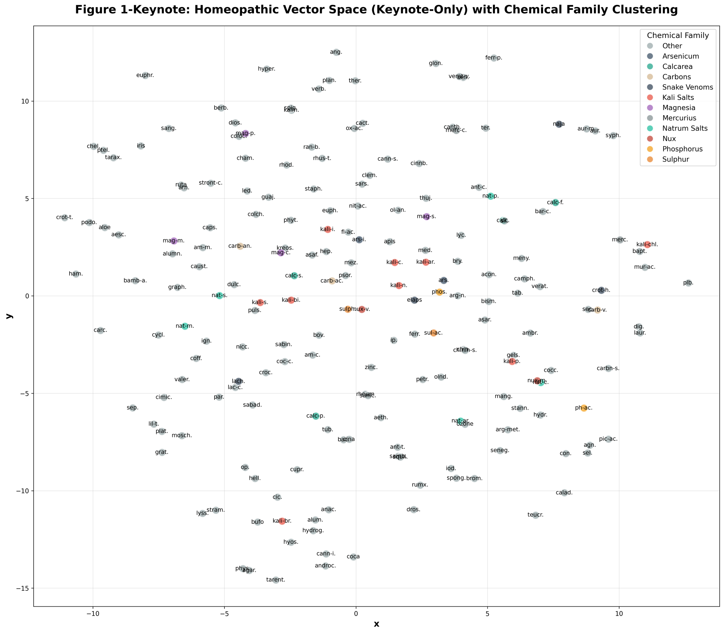 This map reveals the inherent structure of the remedy relationships at a glance. The dramatic difference between essence and keynote clustering validates that the vector space captures two distinct but complementary dimensions of remedy similarity. Chemical families cluster by constitutional nature, while symptoms converge phenomenologically across taxonomy—exactly as homeopathic theory predicts.