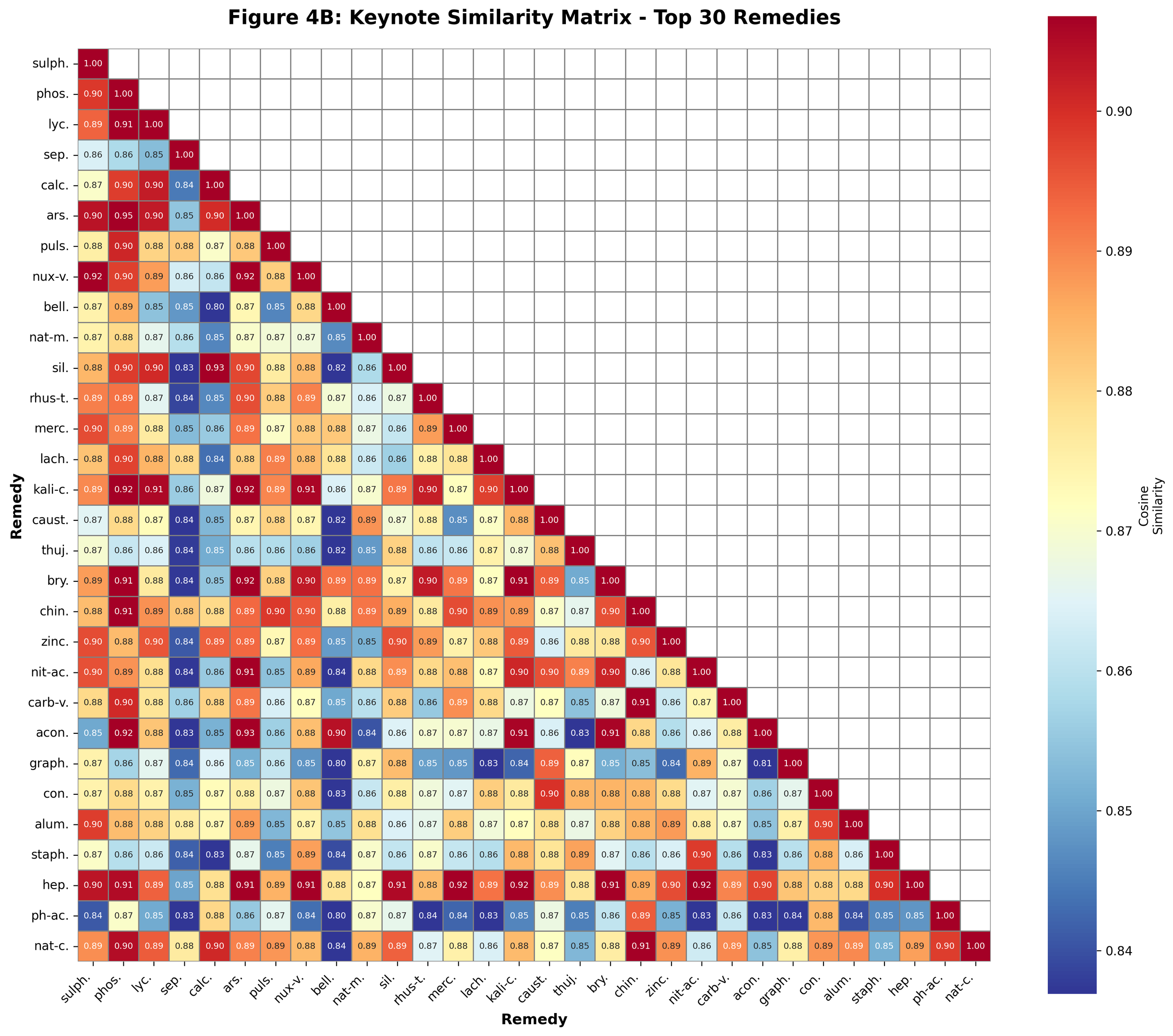 Figure 3: Decomposition of Remedy Similarity by Embedding Type. Three similarity matrices for the top 30 most-documented polychrest remedies. (A) Essence-Only Similarity** (range 0.76-0.88, mean 0.81, σ=0.020) captures constitutional and philosophical relationships. (B) Keynote-Only Similarity (range 0.80-0.95, mean 0.87, σ=0.022) shows higher mean similarity (+8%) with comparable variance, demonstrating that while symptom profiles converge more than constitutional patterns, both dimensions exhibit similar variability. (C) Combined Similarity integrates both dimensions. To properly contextualize these values, we must consider their statistical distributions: truly exceptional pairs (>2σ) reveal distinct patterns. Phenomenological convergence—Phosphorus-Arsenicum (keynote 0.95, z=+3.3σ; essence 0.85, z=+1.9σ) demonstrates remarkable symptom overlap despite different constitutional bases. Constitutional similarity—Phosphorus-Phosphoricum acidum (essence 0.88, z=+3.3σ; keynote 0.87, z=-0.2σ), Calcarea-Silicea (essence 0.87, z=+3.3σ; keynote 0.94, z=+2.8σ), and Calcarea-Kali carbonicum (essence 0.87, z=+3.1σ; keynote 0.87, z=-0.3σ), where chemical relatives share constitutional essence. This decomposition validates the multidimensional nature of remedy relationships: some are constitutionally similar, others symptomatically convergent, and true polychrests balance both.**