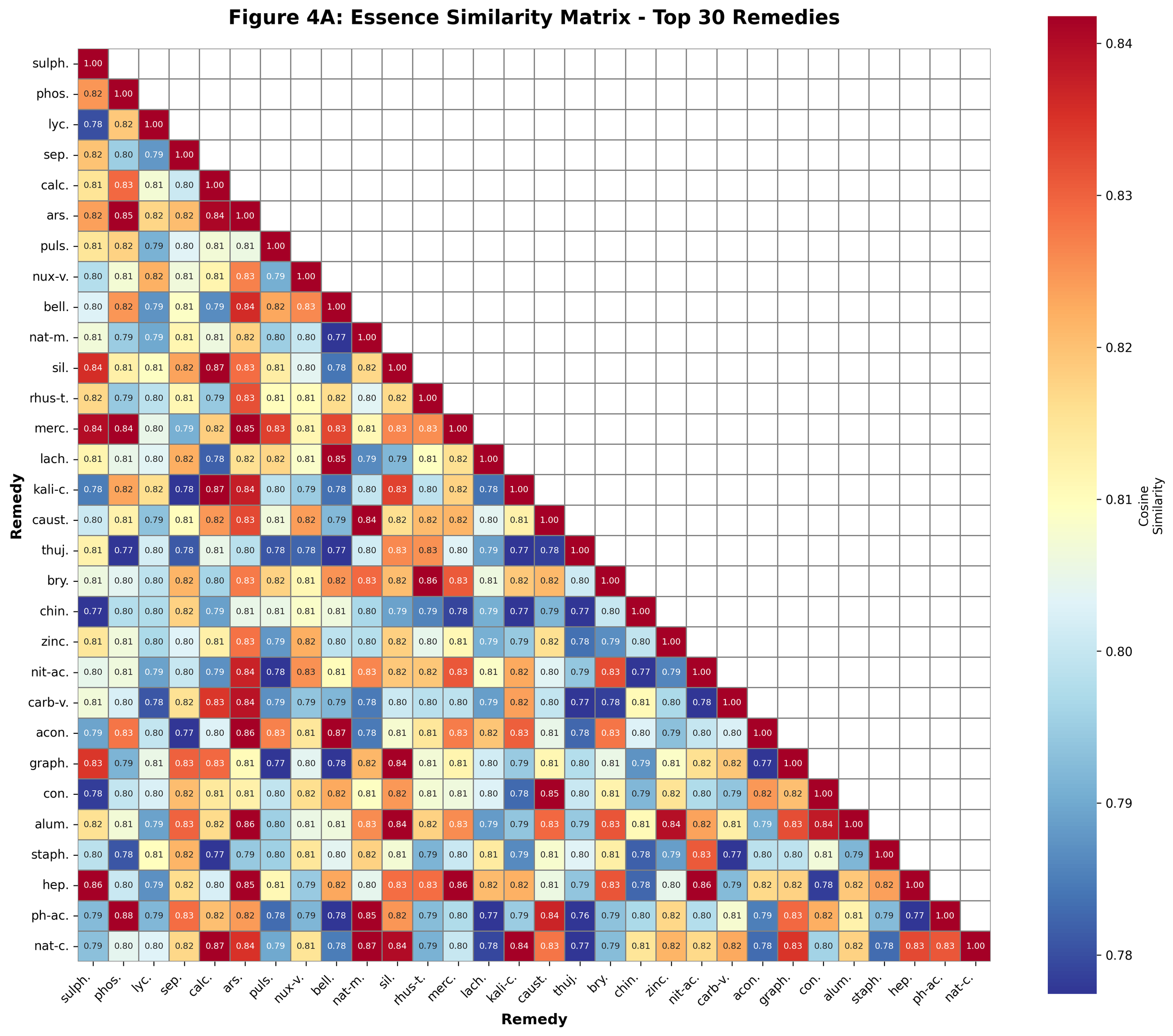 The high intra-family essence similarities (Kali: 0.84-0.87; Natrum: 0.87) reflect the AI’s capacity to recognize shared constitutional patterns despite symptomatological differences.